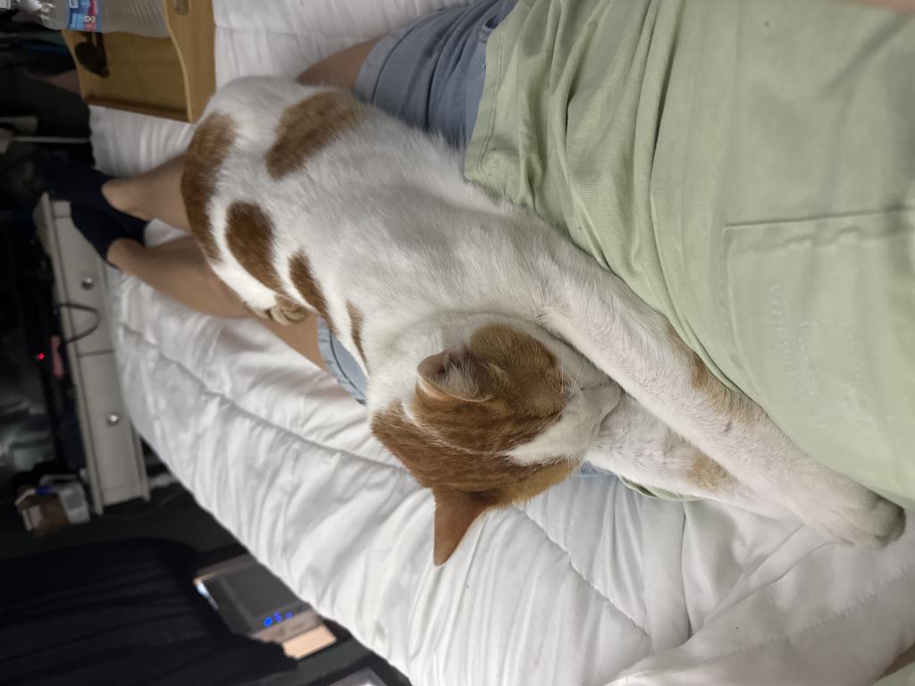 His name is bingo he’s primarily white white some orange on the top of his head and back and tail. Has a Marilyn Monroe orange kiss on his cheek