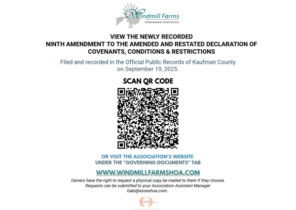 The Ninth Amendment to the Windmill Farms Declaration has been officially recorded with Kaufman County. This amendment includes updates regarding noxious activities, nuisances, leasing and short-term rentals, tenant registration, and owner accountability.